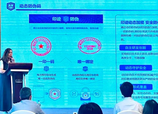 项目路演活动中,矩网科技大客户经理李蕊详细介绍了公司技术创新点、应用场景,充分展现了企业赋能印章管理的独特实力。矩网科技是一家集研发、生产、运营于一体的自主创新型科技企业,被评为高新技术企业、河北省“专精特新”中小企业、信息技术应用创新工作委员会技术活动单位、国家知识产权优势企业,目前已获得290多项知识产权证书。公司团队自主研发了具有突破性和创新性的物电同源一体化智慧印章解决方案“动码印章”。动码印章应用物联网、大数据、人工智能、区块链等技术彻底改变传统印章模式,其三大核心产品动码印章机、动态防伪码、物电一体化印控平台,围绕印章管理、印迹防伪、文件签署、认证服务、储存服务、查验溯源服务形成全方位的管理系统,解决传统印章管理难、易丢失、易伪造等痛点,从根源杜绝假章风险与内部违规用印隐患,提升用印便捷性与效率,实现用印安全与高效统一管理。路演现场,动码印章创新技术理念、成功应用案例以及市场潜力,引发在场投资机构、金融机构和企业代表的浓厚兴趣与关注认可,众多参会者主动与动码印章团队深入沟通。