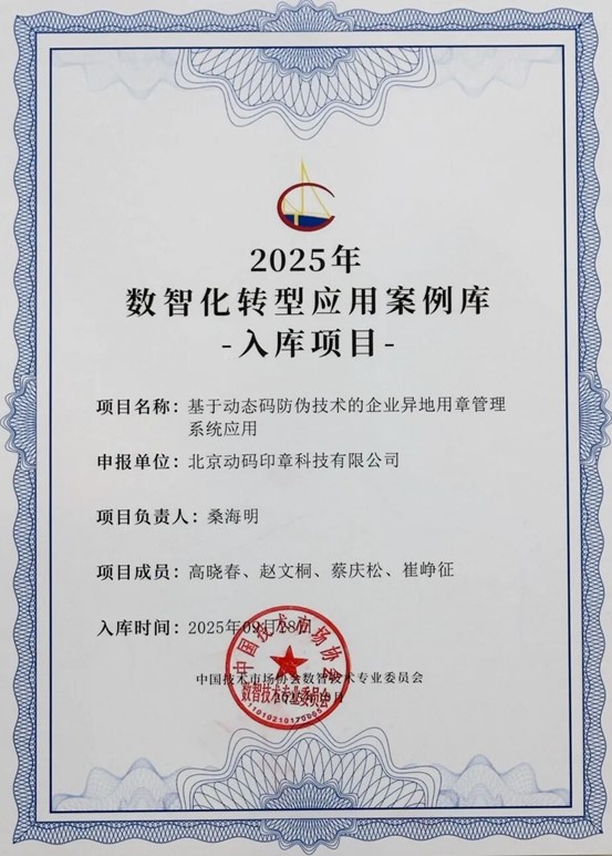 此次发布的数智化转型优秀案例集中反映了各行业领域企业在推动数智化转型、促进经济社会高质量发展的先进成果实践,动码印章在列体现业界对其在印章管理数智化领域突出贡献的高度认可。