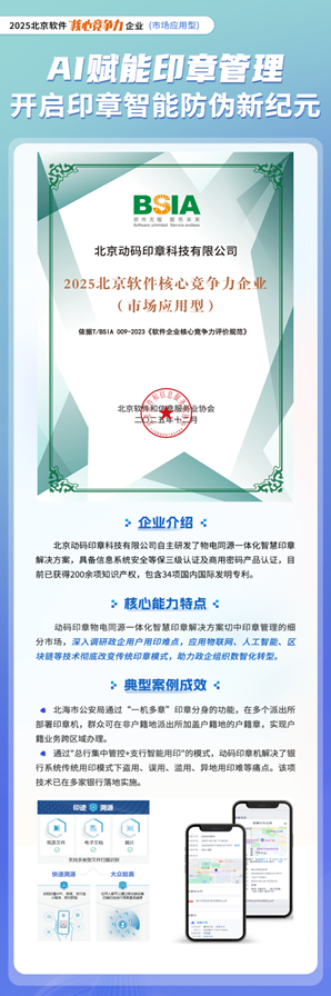 北京软件和信息服务业协会(以下简称“北京软协”)在第十一届会员代表大会第三次会议暨2025企业服务年会上正式发布《2025北京软件企业核心竞争力评价报告》。报告旨在发现当前产业亮点,发展企业核心能力,发掘未来创新引擎。为进一步推动企业建设核心能力、拓展市场、提升品牌影响力,协会对获得“2025北京软件核心竞争力企业(市场应用型)”企业——动码印章核心能力成果进行了展播。